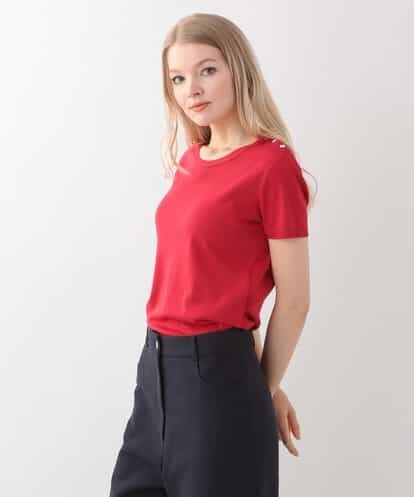 柔らかな肌触りが心地良い、コットンとレーヨンをミックスした糸で編み立てたショートスリーブのニットソー。エレガントなカッティングが目を惹く肩開きのビジューボタンがポイントになった一着です。袖口と裾をリブ仕立てにしたデザインが今年らしさのあるアイテムに仕上がっています。同じテキスタイルで仕立てた【VZKDD02260】もオススメです。model:H170 B81 W59 H88 着用サイズ:M