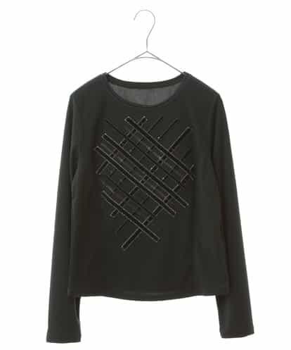 ベロアとスパンコールでバイヤスチェックを表現したカットソー。サイドに入った切替えがタテのラインを強調しメリハリのあるウエストシェイプしたシルエットに。一枚での着用はもちろん、ジャケットやカーディガンのインナーとしておすすめです。model:H167 B80 W59 H85 着用サイズ:M