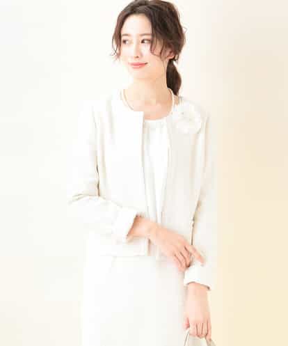 ■セレモニーシーンに欠かせないツイードジャケット■ 毎年ご好評いただいているMKのツイードジャケット。糸からこだわったオリジナル生地とブレードは、より華やかさを重視し光沢感のある仕上がりに。今年はフェザー風の糸を織り交ぜて、より表面感と華やかさを表現しました。ノーカラーの衿元が女性らしくすっきりとした印象に。袖口を折り返して手首を少しのぞかせればぐっと女性らしさがアップします。背抜き仕立てなので長いシーズンで着用できるのも嬉しい。シンプルでベーシックなデザインは飽きがこず、合わせるネックレスやコサージュ、インナーで雰囲気を変えて着回しができるので、3年後、5年後と長く愛用していただけます。同素材のスカート、ワンピースもご用意していますので、ぜひ合わせてチェックしてみてください。