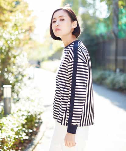 ■ロゴプリントがポイントのカジュアルボーダー■ コットン100%で肌心地の良いボーダープルオーバー。 カジュアルなポンチジャージー地にシルクのような艶をプラスし、 なめらかな質感が表現されています。 襟ぐり・ショルダー・袖口はコットンブレンドの やわらかなニットリブで切り替え、 今年らしいスポーティな要素をミックス。 フロントにさりげなく配されたブランドロゴで、 定番のボーダーアイテムをジョルジュ・レッシュらしい モードカジュアルな一枚に仕上げました。 デザインディティールにこだわりながら、 ベーシックなカラーリングでアウターやボトムスを 選ばず幅広いスタイリングとマッチします。 程よい中肉の素材感で、シーズン問わず合わせていただける 着回し力の高いプルオーバー。 ※屋外での撮影は色味が多少異なる場合がございます。 商品の色味は、スタジオ撮影の画像をご参照ください。 model:H170 B81 W58 H87 着用サイズ:M(38)