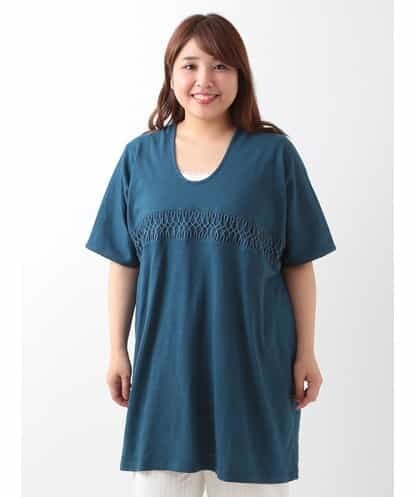 【大きいサイズ】前編みこみUネックチュニック ブルー 1
