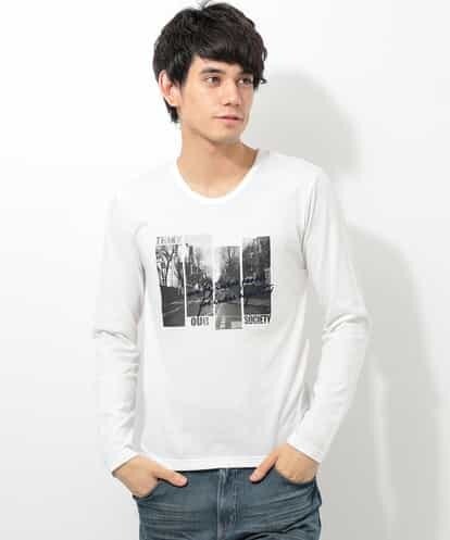 風景のプリントに表情感のあるフロッキープリントが施されたカットソー。着回しやすいクルーネックが好印象の一着です。これからの時期のインナーとしても活躍する一枚です。model:H182 C92 W71 H90 着用サイズ:L