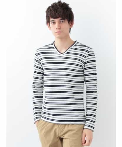 ランダム柄のボーダー柄カットソー。肉厚な素材で仕上げた一枚でシンプルに合わせられるアイテムです。ベーシックなVネックで一枚でも様になるカットソーです。デニムやチノパンなどカジュアルなスタイリングにピッタリなアイテムです。model:H182 C92 W71 H90 着用サイズ:48