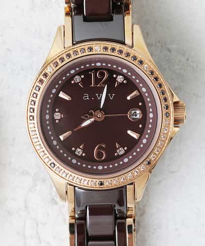 [a.v.v] レディースWATCHコレクション ?「今の自分が、いちばんステキ。」そう思える"時"をこの時計と共に? セラミック&ステンレスのコンビベルト。 ベゼルのキュービックジルコニアが独特な高級感を演出致します。 定期的な電池交換が要らない、ソーラーチャージムーブメント使用。 ギフトにも最適なアイテムとなっております。 ケースの形状 : ラウンドフェイス 風防素材 : ガラス 表示タイプ : アナログ表示 留め金 : Wプッシュバックル ケース素材 : ステンレススティール バンド素材 : ステンレススティール&セラミック 文字盤カラー : ブラウン カレンダー機能 : デイト表示 その他機能 : 日常生活防水 本体重量 : 68g ムーブメント :ソーラーチャージ メーカー保証 : 1年間保証 付属の保証書は大切に保管してください。保証の際に必要となります 生産地 : 中国製(日本製ムーブメント)