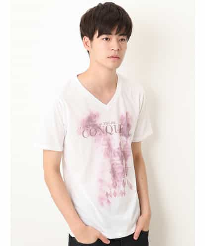 パステルカラーのニュアンシーなアーガイルを背景にレタリングプリントを重ねた目を惹くTシャツ。スッキリとした装いを演出するVネックがクールな1枚!ジャケットやカーディガンなどのインナー使いにもお勧めの重