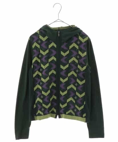 サントーニジャガードのコンパクトパーカーは、着心地抜群。鮮やかな幾何柄で配色表現したコーディネートが楽しくなるアイテムです。ジャケットのインナーとしても活躍する一枚です。model:H167 B80 W59 H85 着用サイズ:M