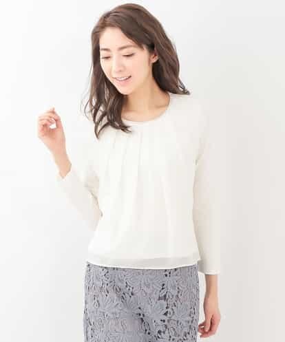 ネックラインに施したビジューが顔周りを華やかに彩るカットソー。タックを施した程よいボリュームのシフォンがフェミニンムードをプラスします。ソフトな風合いと伸縮性に優れたジャージー素材がリラクシーな着心地を叶えます。きれいめスタイルはもちろん、カジュアルなコーデに合わせてもおしゃれにまとめてくれる一着です。model:H170 B82 W58 H85 着用サイズ:M