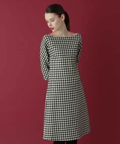 大胆なドット柄のドレス。大きなドットともチェックにも見える柄は、ジャガードのテクニックで織られた生地で、程よく肉感がありシルエットが崩れません。また繊細なパターンにより規則正しく柄を表し、美しいフォルムを作ります。1枚で様になるドレスです。model:H170 B80 W58 H81 着用サイズ:M