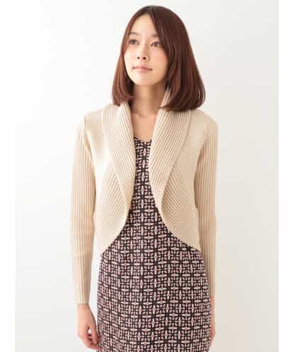 波模様に編まれた編地がアクセントになったニットボレロ。ウール100%の柔らかく滑らかな肌触りと伸縮性に優れ、ストレスフリーな着心地が魅力的な一枚です。ショート丈なのでワンピースなどとすっきり合わせるのがお勧めです。model:H170 B80 W60 H86 着用サイズ:40