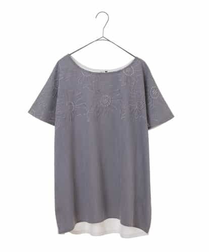 前後身頃を異素材でドッキングさせたフレンチスリーブのカットソー。大胆に入ったフラワー刺繍が顔周りを華やかに飾ります。後ろを長めにとったバックテイルデザイン。首周りを大きく開いたカットがデコルテをキレイにすっきりと演出してくれます。