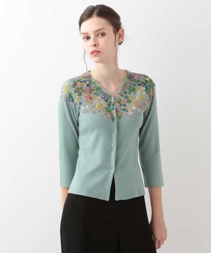 女性らしさが引き立つ刺繍のニットカーディガン。肩からフロント部分に施された刺繍がデコルテをきれいに見せ、コーディネートの主役にもなります。着丈も程よく、パンツ・スカートにも合わせていただける万能なアイテムです。