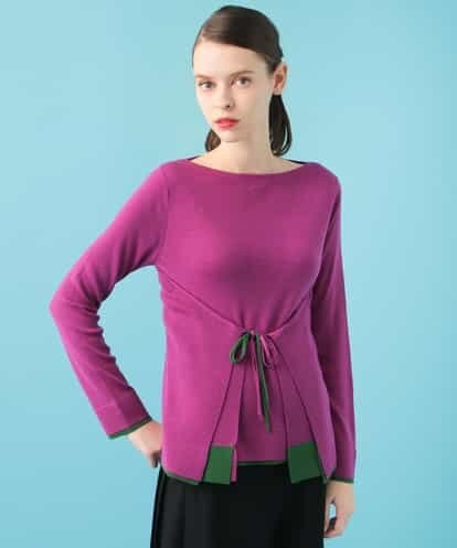 ファインウールで編み立てた上品な肌触りに袖口や裾をバイカラーでコーディネイトしたニットプルオーバー。前後でサイドのリボンで結んでアレンジを楽しめるデザインになっています。そのままドレープを活かしたスタイリングもお勧めです。メリハリのある色使いがエレガントさに個性をプラスした一着に仕上がっています。model:H170 B80 W58 H81 着用サイズ:M