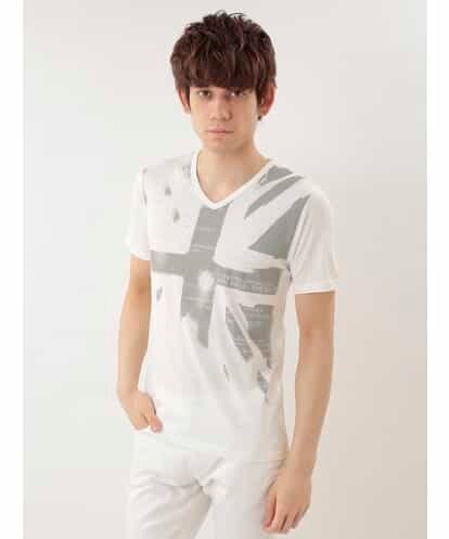 ユニオンジャックと英字を合わせ、格好いいバンドTを思わせるVネックTシャツ。一枚で合わせても、ジャケットやカーディガンなどに合わせてもコーデの主役になる一枚です。コットンミックスの着心地の良さもお勧めです。