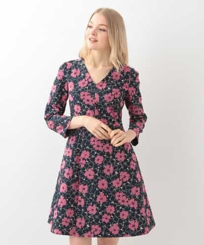 立体感のあるジャカードテキスタイルのフラワー柄が鮮やかに映えるドレス。Vネックにラップスカートのようなデザインがすっきりとまとまったフロントに、ドレープを持たせたバックのフレアシルエットが女性らしさをプラスした一着です。バックのメタルジップもアクセントに。同じテキスタイルで仕立てた【VVECD04590】もお薦めです。※裏地付き、バックファスナーmodel:H170 B81 W59 H88 着用サイズ:M