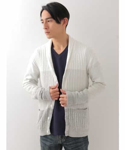 しっかりとした厚みのあるショールカラーのニットアイテムです。グラデーションになったボーダーの編地に、身頃部分は太めのリブ編みで変化を付けています。フロントを開けてカーディガンのようにも、ボタンを留めてショールカラージャケットのようにも使えるトップスです。model:H182 C92 W71 H90 着用サイズ:48