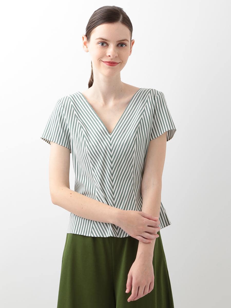 ストレッチの効いたストライプ素材で仕立てたブラウス。ストライプのバイアス使いが作り出す視覚的にも美しいデザインが、すっきりとしたトップスに個性をしっかりとプラスした一着に仕上がっています。洗練されたミニマルなシルエットにVネックがフェミニンな印象の、大人のモードカジュアルなブラウスです。同じテキスタイルで仕立てた【GBHGB20290】もおすすめです。※バックファスナ?